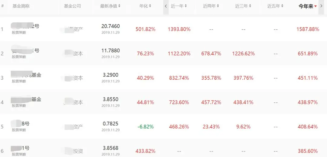 来自私募排排网的最新私募监测数据显示,截至12月5日,按照所有股票策略私募产品最新一个净值公布日计算,6124只股票私募产品中排名首位的私募产品,今年以来的收益率高达1587.88%,这一收益率相当于今年以来沪深300指数涨幅(截至12月5日收盘,沪深300指数年内涨幅为28.85%)的55倍,高出第二名(651.89%)逾900个百分点。