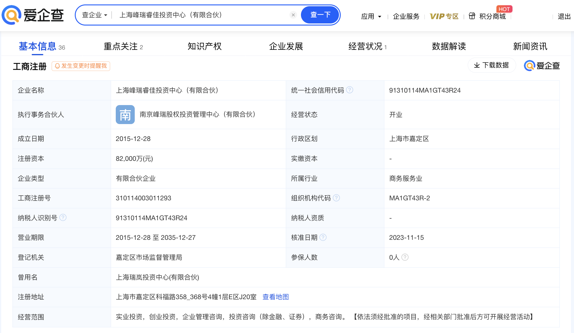 爱企查App显示,上海峰瑞睿佳投资中心(有限合伙)成立于2015年12月,执行事务合伙人为南京峰瑞股权投资管理中心(有限合伙),经营范围包括实业投资,创业投资,企业管理咨询,投资咨询、商务咨询。