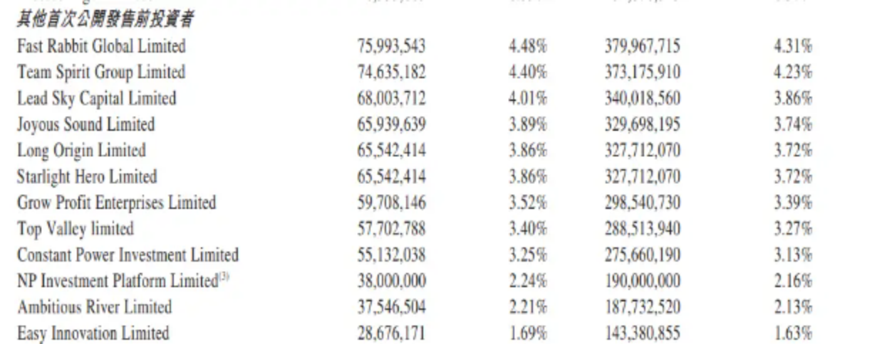 不仅段永平,在极兔的招股书中,也隐晦地出现了其他步步高系人员的身影。招股书“其他首次公开发售前投资者”中Team Spirit Group Limited持有极兔4.4%的股份,据招股书说明,广东欧加控股有限公司工会委员会持有Team Spirit Group Limited65.9%的股份,前者被视为段永平另一门徒、OPPO创始人陈明永控制。而且,陈明永妻子Laio XiaoJing全资持有的Starlight Hero Limited也拥有极兔3.86%的股份。