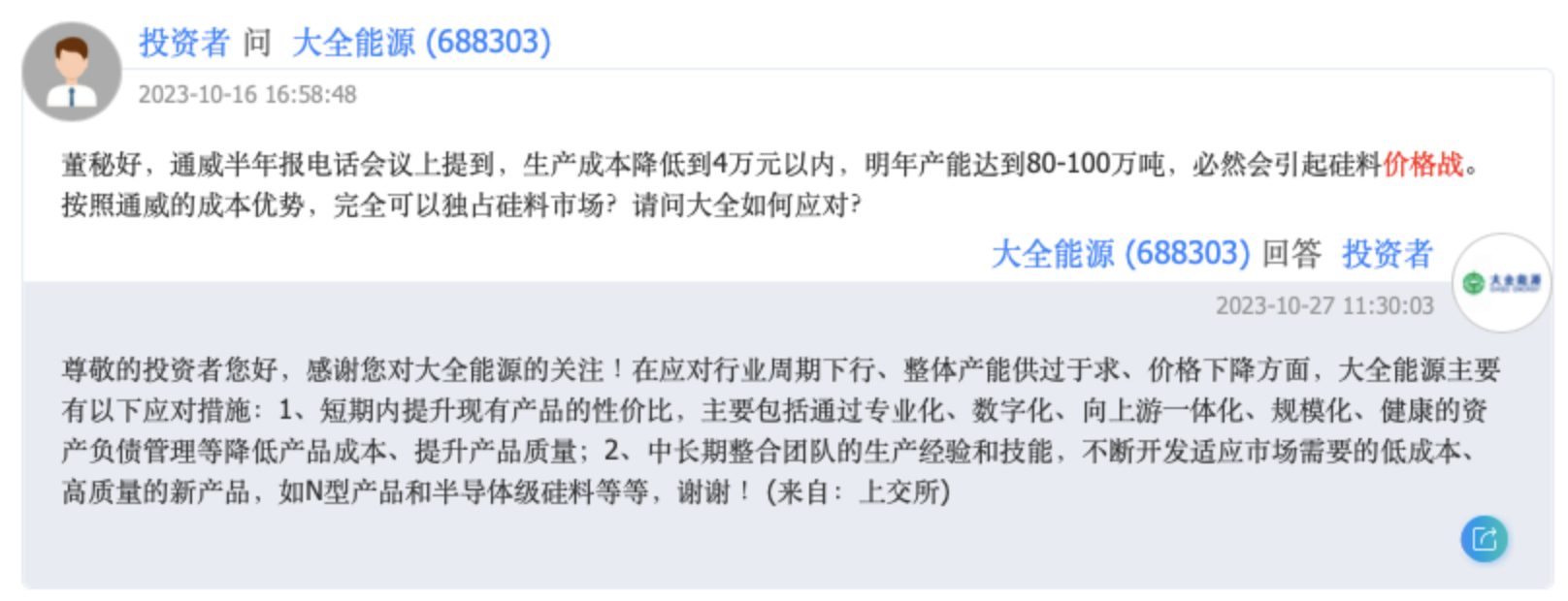 “在应对行业周期下行、整体产能供过于求、价格下降方面,大全能源主要有以下应对措施:1、短期内提升现有产品的性价比,主要包括通过专业化、数字化、向上游一体化、规模化、健康的资产负债管理等降低产品成本、提升产品质量;2、中长期整合团队的生产经验和技能,不断开发适应市场需要的低成本、高质量的新产品,如N型产品和半导体级硅料等等。”大全能源在面对投资者提问时表示。