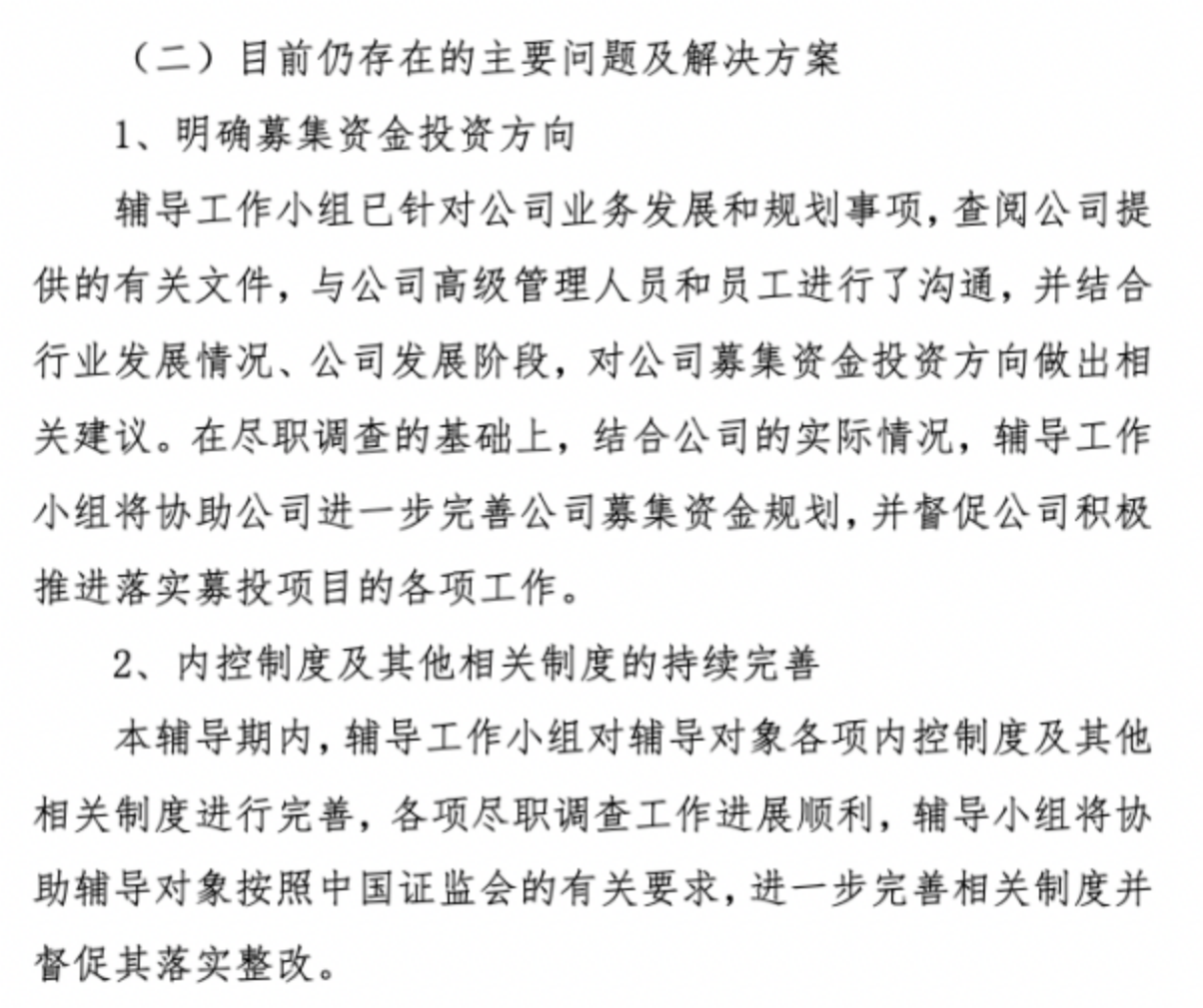 据最新辅导工作进展情况报告显示,武汉大全现在的主要问题为:明确募集资金投资方向,和内控制度及其他相关制度的持续完善。