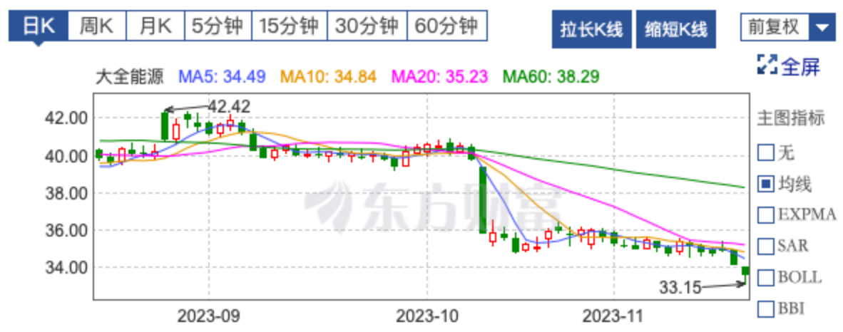 大全能源的股价也持续下跌,总市值从最高1800亿元跌至如今的722.6亿元,截至2023年11月19日,报收33.69元/股。