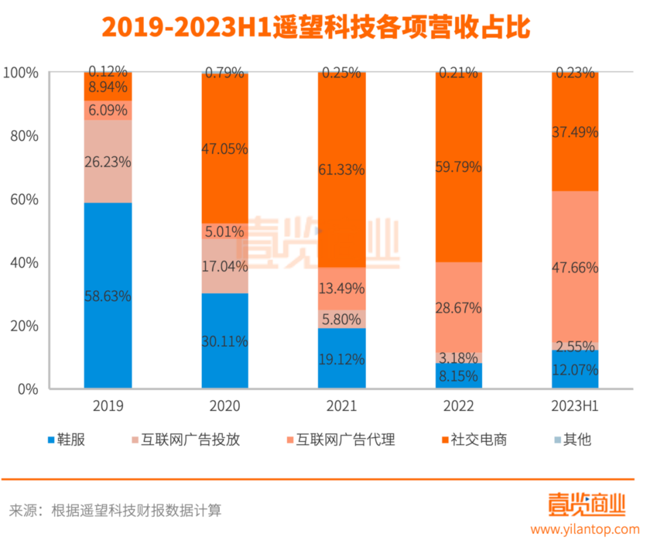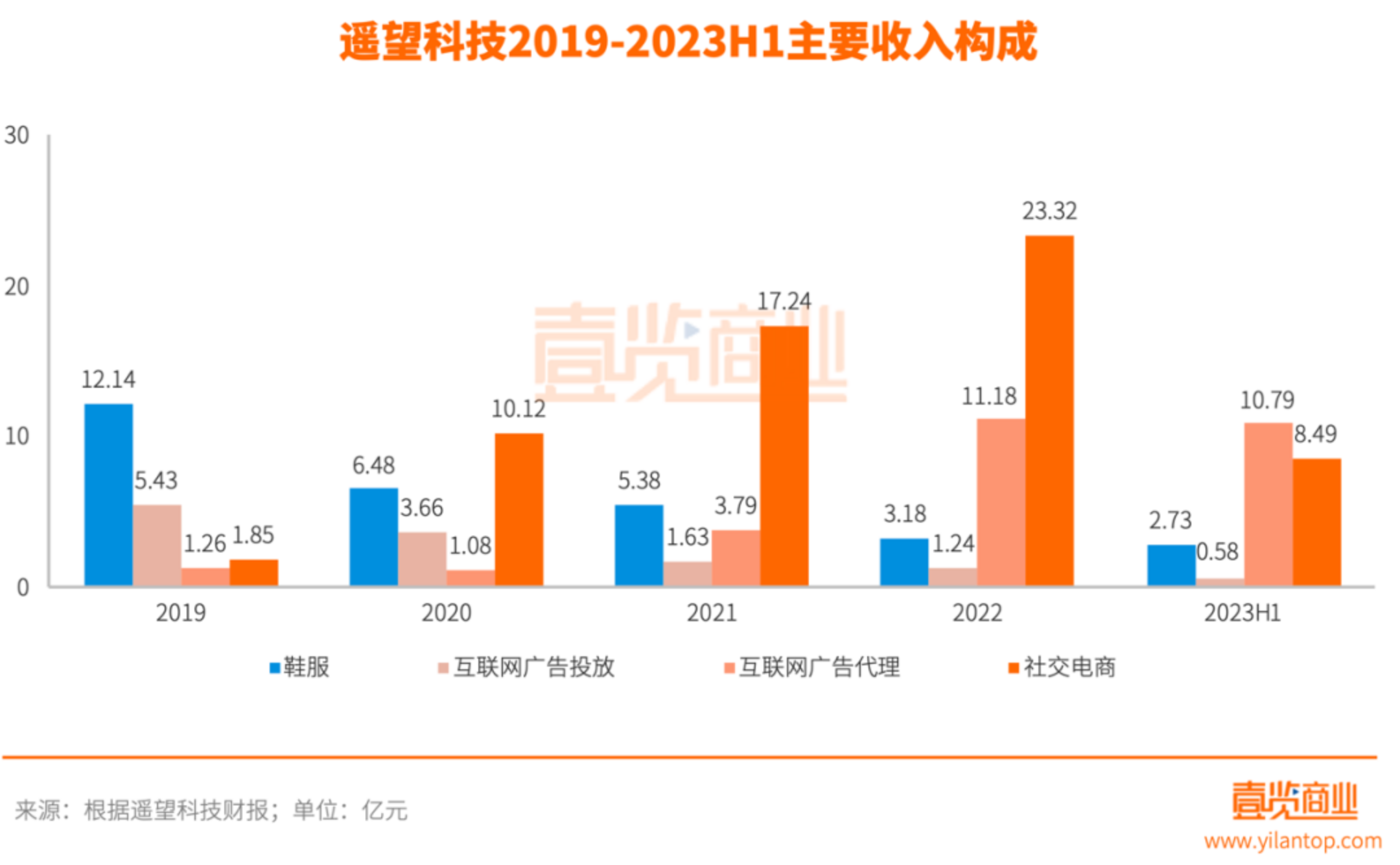 此前在2020年到2022年,社交电商服务都是遥望科技的最大营收来源。但今年上半年,传统的互联网广告代理服务贡献的营收同比大增213.14%至10.79亿元,占比总体47.66%,超过了社交电商的37.49%。