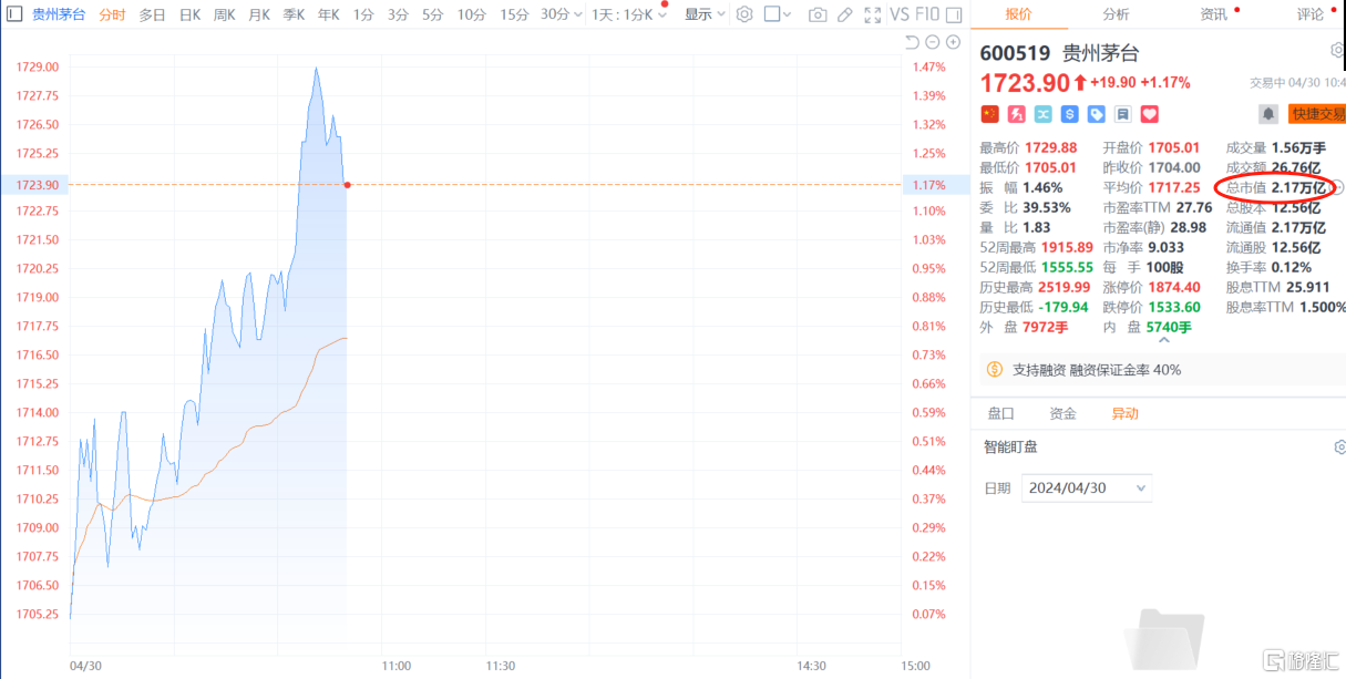 截至发稿,茅台涨1.17%报1723.9元,总市值2.17万亿元。