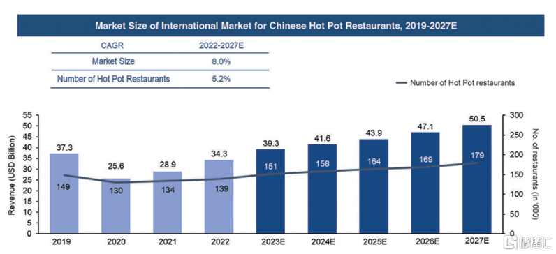 受疫情影响,2020年国际市场上中国火锅店的市场规模明显下滑,2022年回升至343亿美元,按8%的复合年增长率计算,到2027年将达到505亿美元。