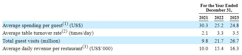 不仅翻台率没回到疫情前的水平,特海国际还面临着人均消费下降的压力。招股书显示,2021年至2023年,特海国际的餐厅人均消费已从30.3美元降至24.8美元。