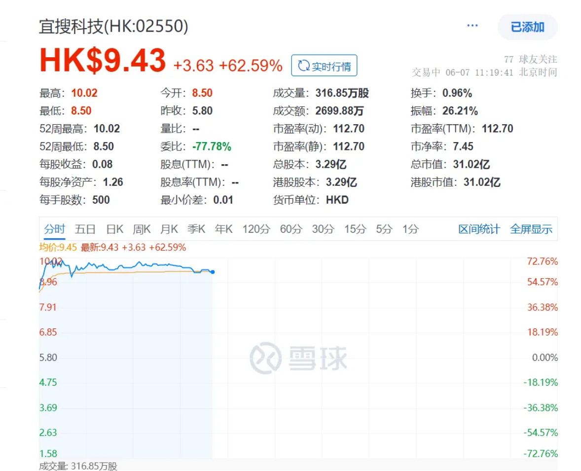 6月7日,初代互联网公司宜搜科技正式登陆港交所。上市首日,宜搜科技开盘价为8.5港元/股,高开46%。上午9时45分,宜搜科技报9.89港元/股,较发行价大涨70.52%,市值超32亿港元。