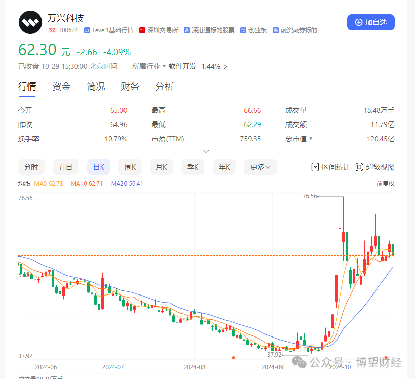 然而,概念炒作总会退潮。从2023年年中至2024年9月中旬,万兴科技的股价从最高点123.06元/股暴跌至37.92元/股,跌幅超过了65%,市值蒸发超过了160亿元。截至10月29日收盘,收于62.3元/股,其市值为120.45亿元,距离最高点,市值仍蒸发近一半。