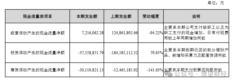 而报告期内,公司经营活动现金净流入为721.61万元,较去年同报告期经营活动现金净流入减少1.18亿元,同比较去年同期下降94.22%。