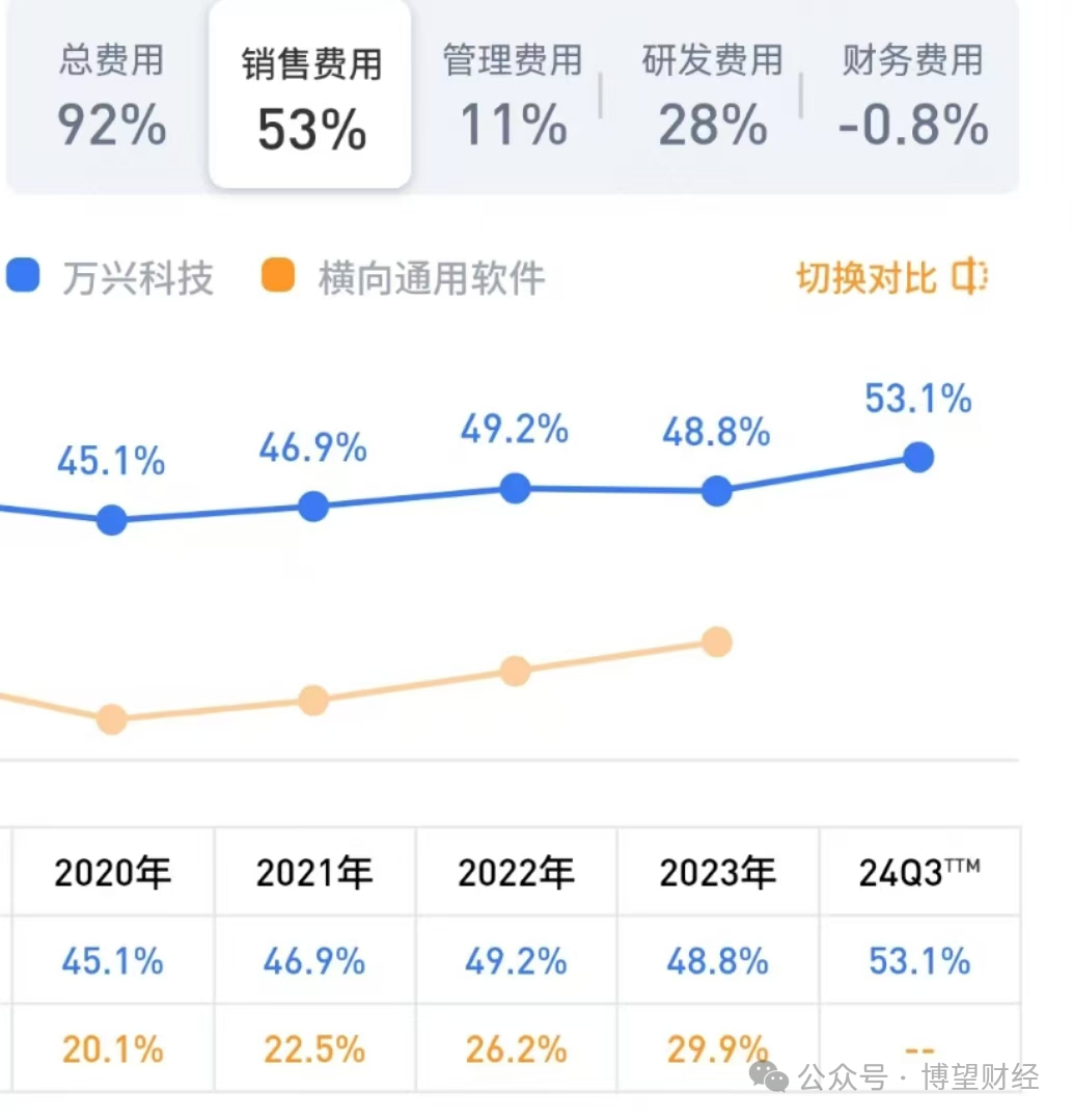 从2020-2024年Q3,万兴科技销售费用占比分别为45.1%、46.9%、49.2%、48.8%、53.1%,销售费用呈现持续升高态势。前三季度销售费用率、管理费用率、研发费用率分别为55.7%、11.4%、29.1%,合计较上年同期提升7.3%。