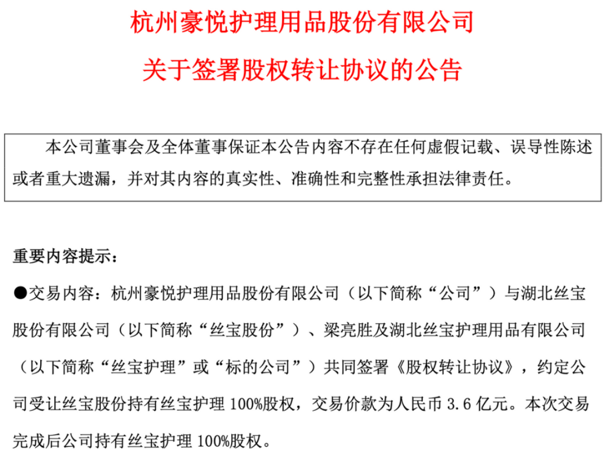 11月11日,A股“纸尿裤第一股”豪悦护理发布公告称,公司与湖北丝宝股份有限公司(以下简称“丝宝集团”)、梁亮胜及丝宝护理共同签署《股权转让协议》,约定公司受让丝宝集团持有丝宝护理100%股权,交易价款为3.6亿元。