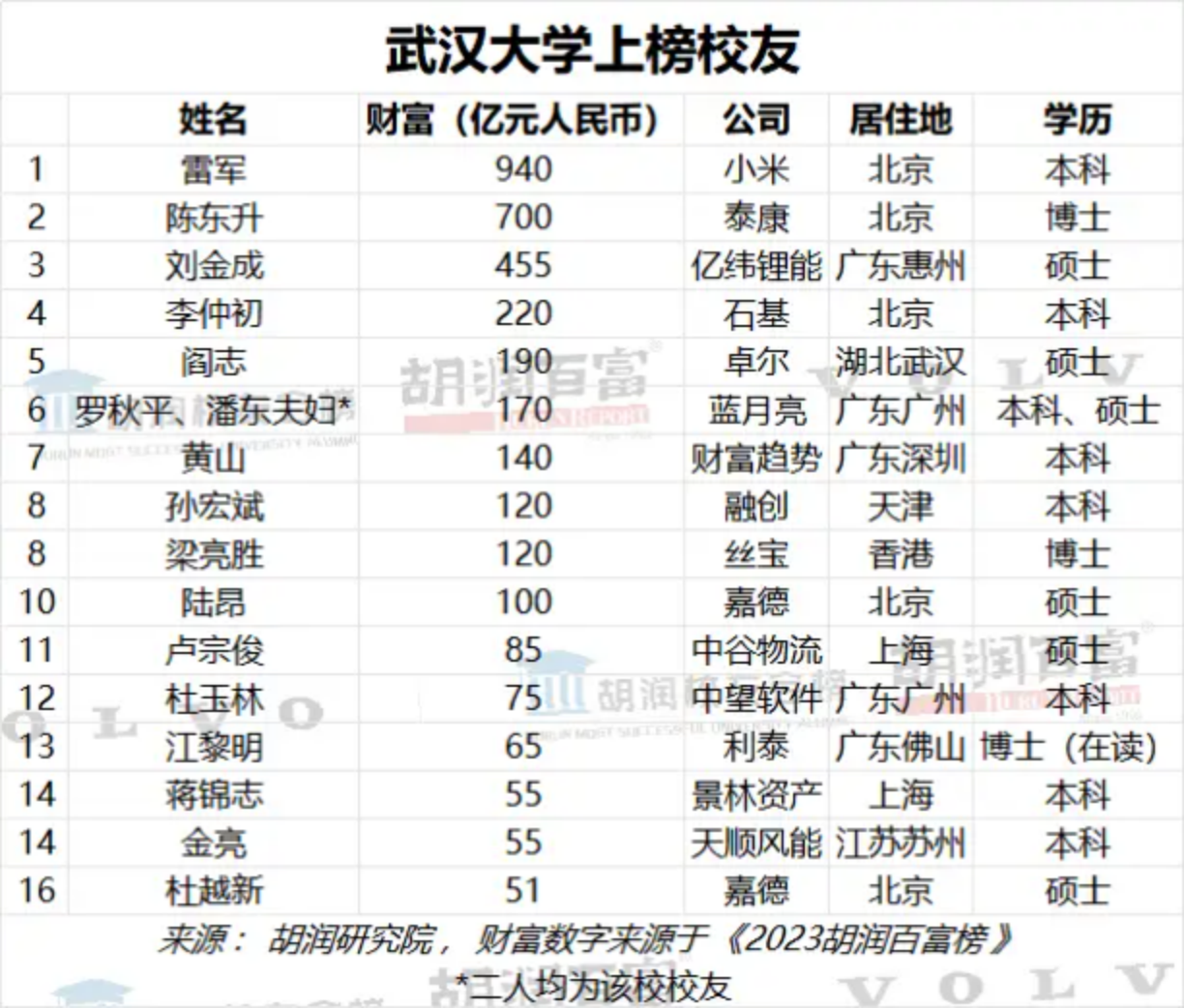 就连中国商界,“武大系”同样是不可忽视的存在。胡润研究院发布的《2023胡润校友会榜》显示,武汉大学位列榜单第五名。登上2023胡润百富榜的1500多位企业家中,其中有雷军、陈东升、刘金成等17位武大校友。
