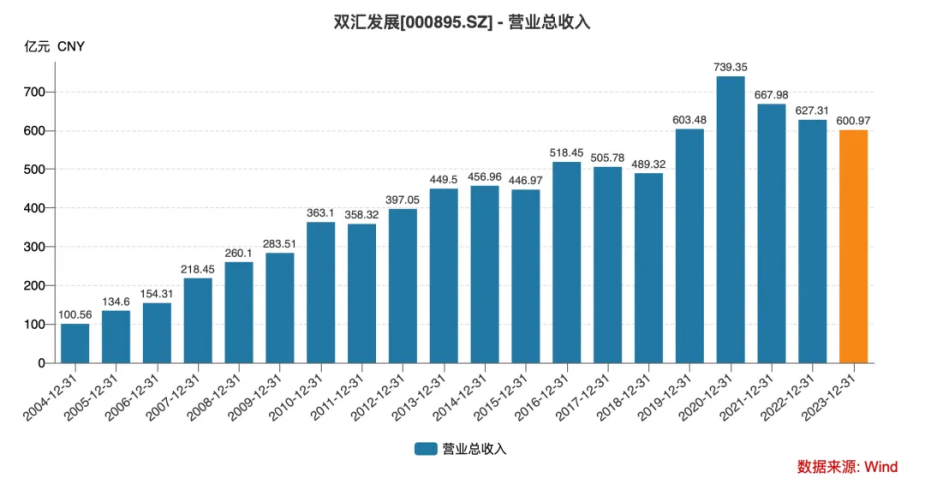 经营方面,双飞发展巅峰时期的业绩也是出现在2020年,总营收739.35亿元,归母净利润为62.56亿元。此后便开始逐渐滑坡,2021-2023年营收分别是667.98亿元、627.31亿元、600.97亿元,归母净利润分别为48.66亿元、56.21亿元、50.53亿元。