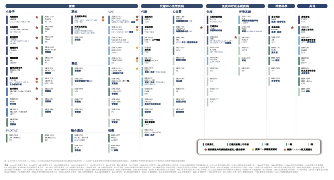 截至2024年12月29日,恒瑞医药拥有110多款商业化药物,包括17款新分子实体药物和四款其他创新药;截至同日,恒瑞医药的管线涵盖超90款候选新分子实体创新药和八款处于临床及更后期阶段的其他在研创新药,包括30多款处于关键性临床研究及更后期阶段的在研创新药。