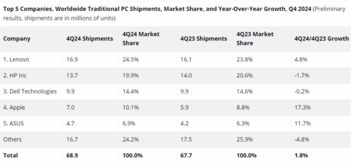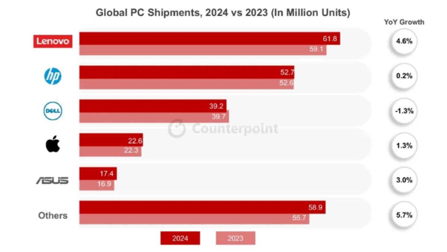 据IDC和Counterpoint数据分别显示,2024年全球PC出货量分别为2.63亿台和2.53亿台,较2023年分别仅增长1%和2.6%。
