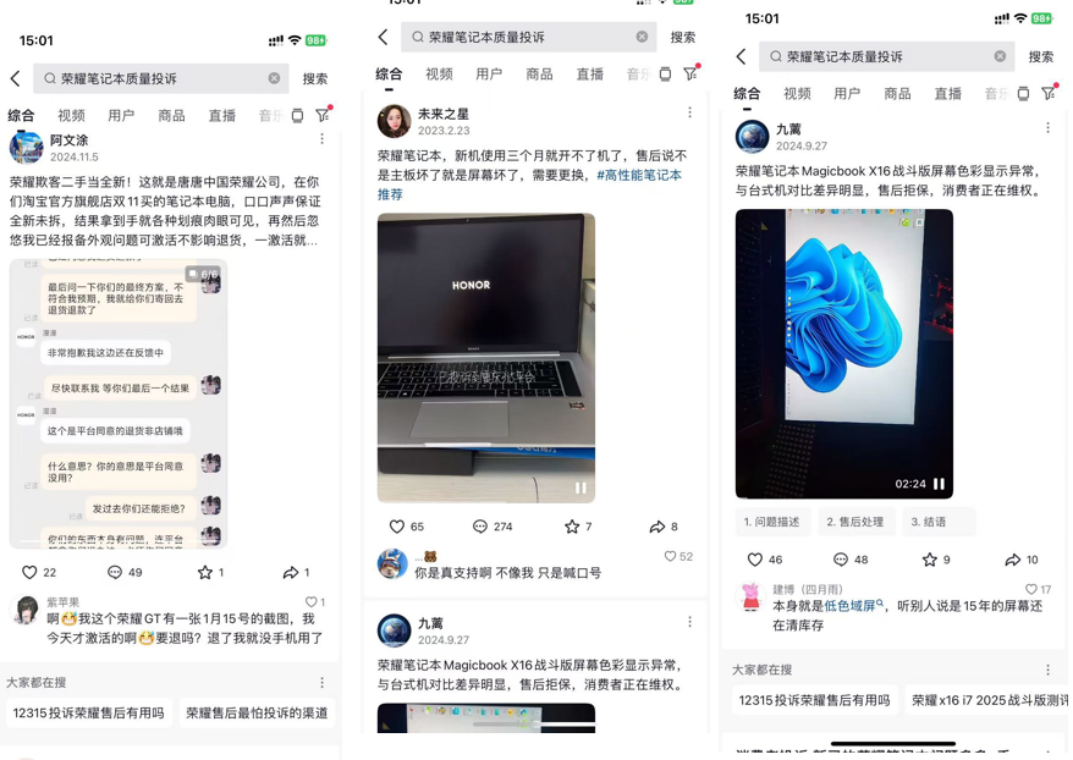 荣耀笔记本电脑销量本就欠佳,社媒平台上和黑猫投诉平台关于荣耀笔记本质量的投诉同样会加重很多同行的担忧。笔记本电脑和大家电行业类似,由于消费者使用周期相对较长,做好本地化售后是门店存活的关键。