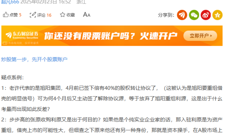 股吧里,有投资者发帖质疑张源收购利源股份的目的,还罗列了张源买卖多只A股股票的“战绩”,并猜测张源是否真要做实业、搞好利源股份?