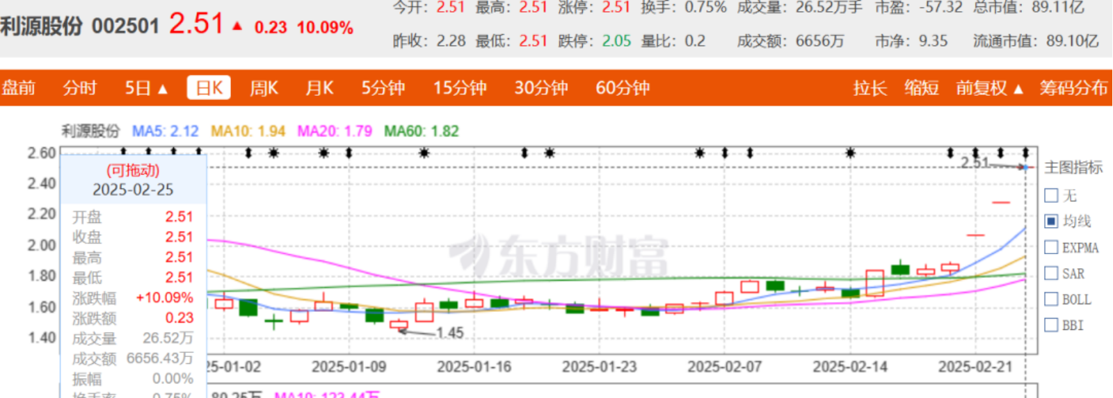 截至2月25日收盘,利源股份股价为2.51元/股,相比2月20日收盘价,已经大涨33.51%。