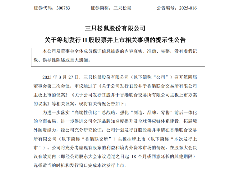 3月27日晚间,三只松鼠披露公告称,公司计划发行H股股票并申请在香港联交所主板挂牌上市。