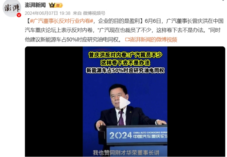 曾庆洪在广汽集团董事长位置上任职9年,一直以“低调务实”的形象示人,很少对外发声。但在任上最后一年,曾庆洪为广汽集团和汽车产业振臂一呼,他直言:“广汽不反对价格战,也不怕打价格战,但是要有理性和有底线,不能过度。”“让利可以,但让本不可持续。”同时,他建议相关政府部门能够适时研究“油电同权”政策。