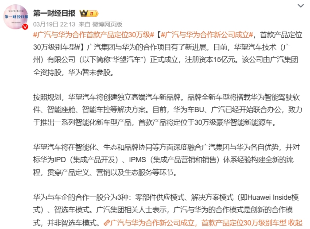 3月19日,广汽集团与华为的合作项目有了新进展。广汽集团宣布,由广汽集团投资15亿元设立的新公司华望汽车技术(广州)有限公司(下称“华望汽车”)正式成立,全新高端智能汽车品牌也将在不久公布;该公司由广汽集团全资持股,华为暂未参股。