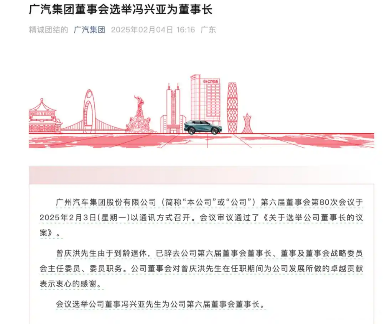 2月4日,广汽集团发布公告,宣布曾庆洪因年满退休年龄,已辞去公司第六届董事会董事长、董事及董事会战略委员会主任委员职务,并宣布冯兴亚为新一任董事长。至此,广汽集团进入“冯兴亚时代”。