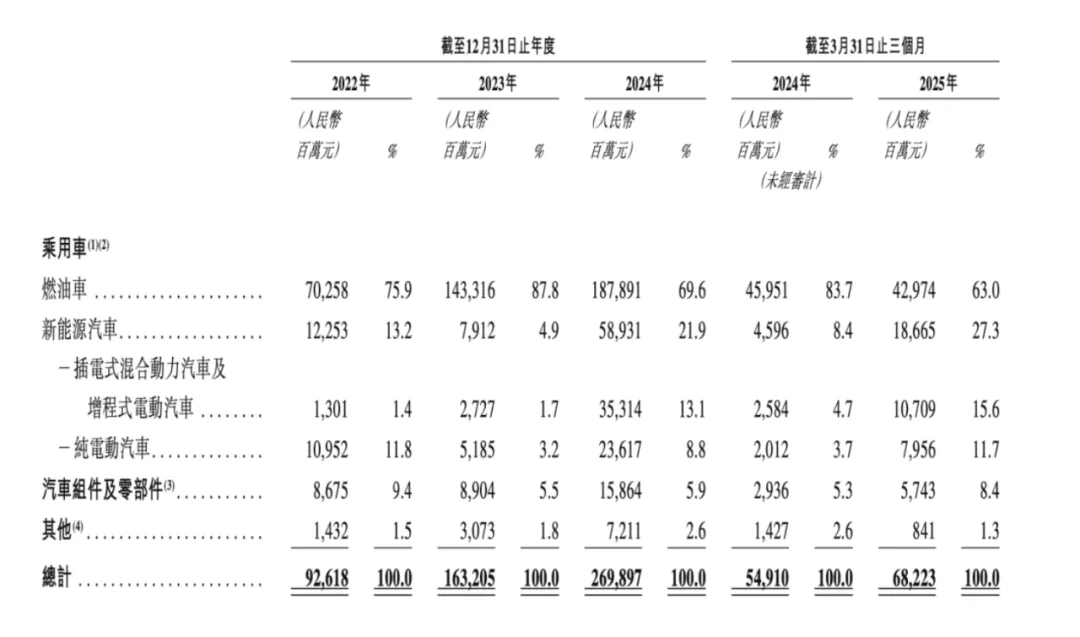 奇瑞汽车的招股书显示,从2022年到2025年一季度,燃油车板块对奇瑞整体收入的贡献度分别为75.9%、87.8%、69.6%和63%。作为对比,新能源汽车的同期贡献分别为13.2%、4.9%、21.9%和27.3%。