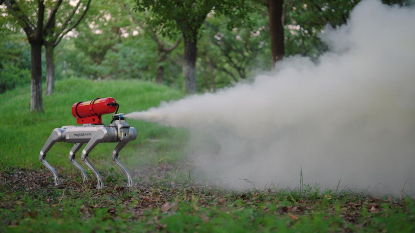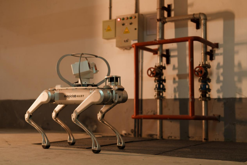 在电厂、化工厂等巡检场景中,Y1可选配搭载红外热成像和多气体检测模块,实时监测设备状态与环境数据,一旦识别到异常,立即触发报警,并通过远程平台上报,显著降低人工巡检的风险;MagicDog Y1采用航空级密封机身,具备IP67防护等级,-20℃至55℃正常工作能力,能在粉尘、极寒、高温等严苛工业环境中稳定运行,助力企业实现全天候、高可靠的自动化巡检与安防作业。