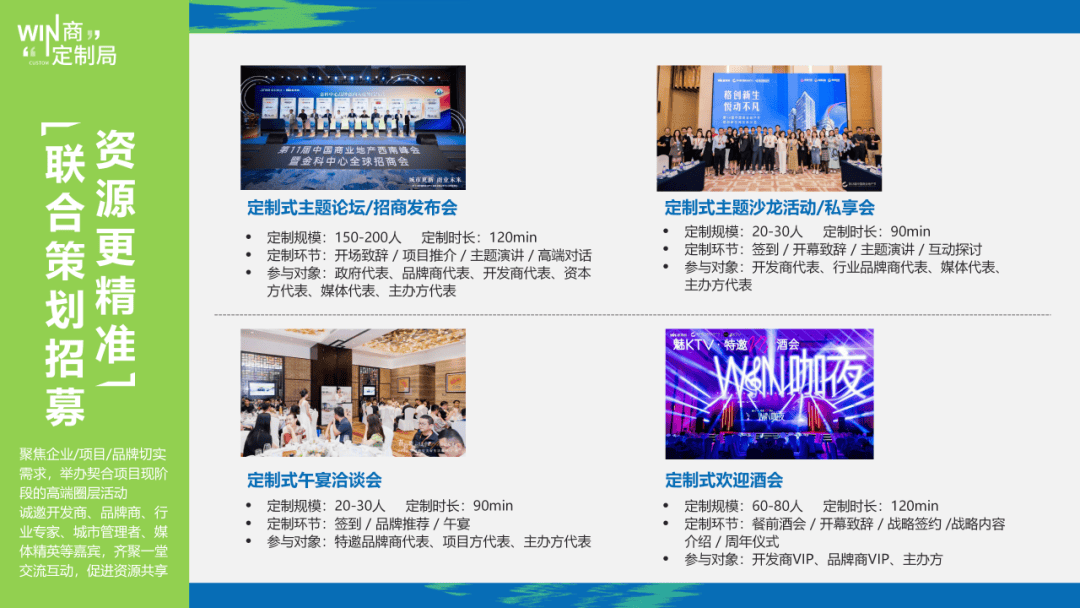 依托大会影响力与稀缺资源平台,为企业提供深度战略赋能解决方案。基于项目筹开、调优等核心需求,量身构建品效合一的推广活动矩阵,精准制导潜在合作方触达;同步嫁接大会资源通路,驱动项目与品牌从资源精准对接到合作共建,实现商业价值的高效兑现。