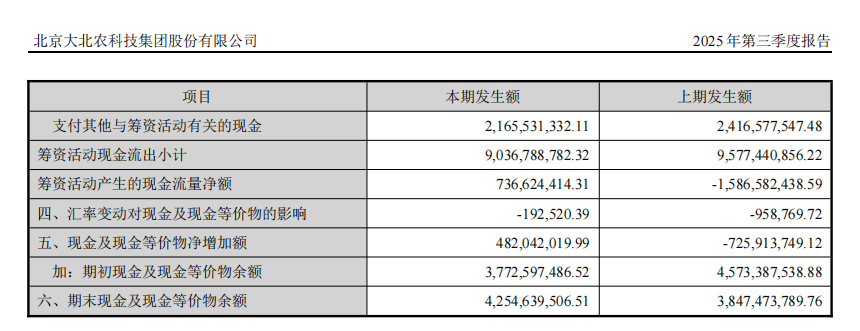 相比之下,经营端的现金流表现,则反映业务活动的稳定性与回款能力。大北农2025年第三季度报告显示,前三季度大北农实现经营性现金流净额约4.79亿元,同比下降63.45%。从现金流结构看,销售商品和提供劳务收到的现金约208.58亿元,与同期营业收入基本匹配,收现能力维持稳定。