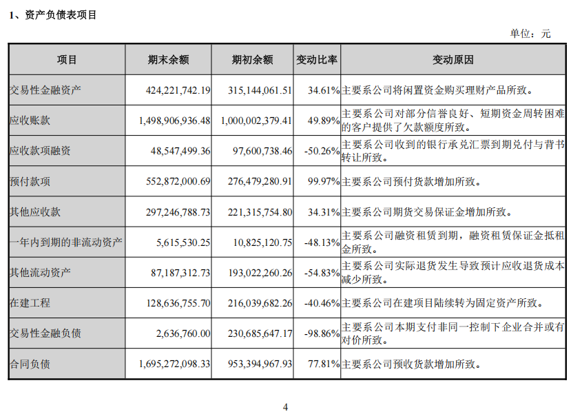 同期,预付款项约5.53亿元,较年初的约2.76亿元几乎翻倍,一定程度上说明其对上游采购预付比例上升。而上游采购预付增加,说明其对未来供给的前置布局,也可能与原材料备货等因素有关。