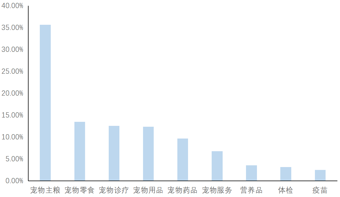宠物行业按照细分赛道可以分为宠物食品、宠物用品、宠物医疗、宠物服务、宠物殡葬等。其中,宠物食品与宠物医疗具有较强的刚需属性,是宠物行业的主要消费市场;宠物用品也是宠物行业的重要组成部分,目前呈现出明显的细分化特征。