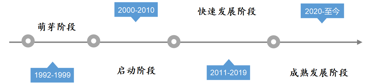 中国宠物行业的发展可追溯至20世纪90年代,行业发展历程大致可分为四个阶段:萌芽阶段、启动阶段、快速发展阶段、成熟发展阶段。现阶段国家开始对与宠物相关的各行业进行规范化管理,中国宠物相关行业逐渐走向规范化、标准化。