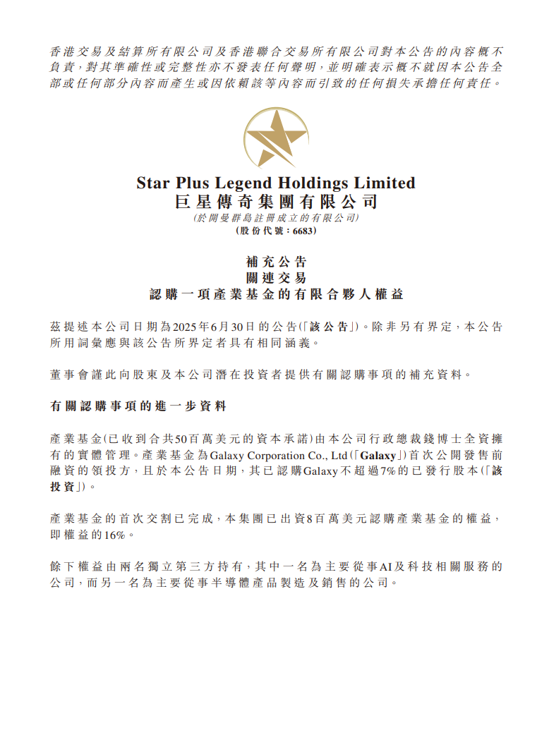 巨星传奇表示,成为Galaxy的战略股东预期将为公司带来多方面的协同效益,双方正就策略性合作的细节进行深入讨论,合作范畴包括但不限于与Galaxy艺人合作举办展览、演唱会、艺人IP及衍生品开发等。