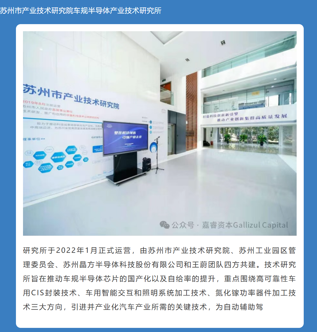 为把握汽车产业智能化,电动化和网联化带来的新机遇,致力于车规半导体新工艺、新材料、新设备的研发与战略布局,近日,苏州晶方半导体科技股份有限公司与苏州思萃车规半导体产业技术研究所有限公司、苏州嘉睿资本管理有限公司、苏州鼎旭控股有限公司共建“苏州聚芯产业园管理有限公司”。
