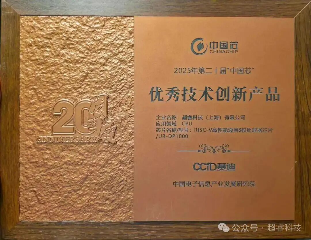 近日,备受行业瞩目的2025年“中国芯”集成电路产业促进大会暨第二十届“中国芯”优秀产品征集结果发布仪式圆满落幕。超睿科技凭借自主研发的UR-DP1000 RISC-V高性能通用处理器芯片,从303家参赛企业,410款申报产品中脱颖而出,成功斩获2025年第二十届“中国芯”【优秀技术创新产品】奖。