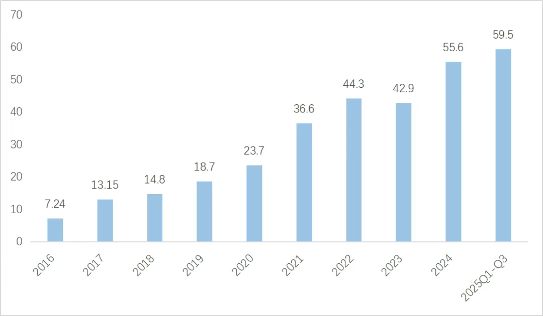 在制造业智能化升级的需求拉动,以及上游核心零部件国产化率逐渐提升的背景下,我国工业机器人产量持续保持增长态势。2016年中国工业机器人产量为7.24万台,到2024年增至55.6万台,年均复合增长率超过20%。2025年以来,我国工业机器人产业延续强劲发展态势,前三季度全国总产量已达59.5万套,超过去年全年总量,国产化率实现跨越式提升。