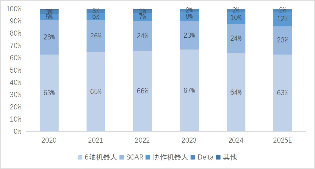 从短期发展趋势看,6轴机器人仍为市场主流产品,在汽车、新能源等行业应用广泛,其中大负载机器人将是未来发展趋势,且随着国产厂商技术能力的不断提升,国产品牌的市场份额将逐步提升.