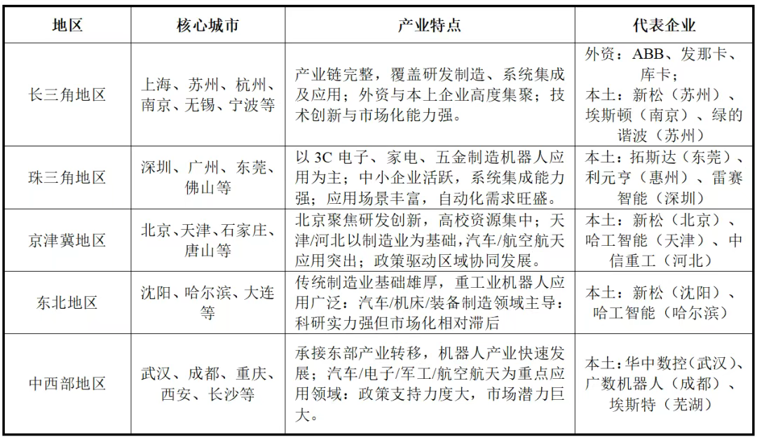 由于工业机器人存在巨大的市场潜力和发展空间,各地纷纷将工业机器人产业作为制造业转型升级的重要抓手,大力发展工业机器人人。目前,中国工业机器人产业主要分布在长三角、珠三角、京津冀、东北地区和中西部地区,各区域根据自身产业基础和优势,形成了差异化的发展路径。长三角和珠三角以高端制造和系统集成为主,市场化程度高。京津冀和东北地区依托传统制造业,重点发展重工业领域应用。中西部地区通过产业转移和政策支持,快速发展机器人产业,潜力巨大。