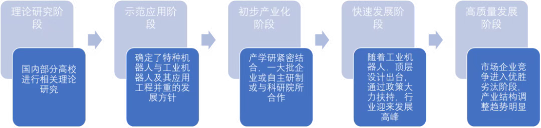 我国的工业机器人研究开始于20世纪70年代,大体可分为5个阶段,即理论研究阶段、示范应用阶段、初步产业化阶段、快速发展阶段、高质量发展阶段。