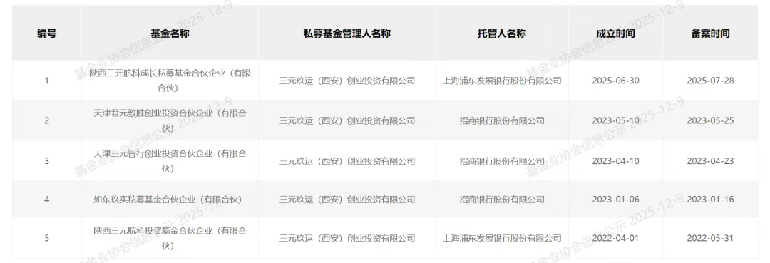 更具战略意义的布局,是成立于2021年的私募投资平台——三元资本。作为一家新锐CVC机构,由严建亚实际控制,并专注于航空航天、新材料、先进制造等与三角防务主业协同的赛道。中国证券投资基金业协会官网数据显示,三元资本的机构主体三元玖运(西安)创业投资有限公司,其在管基金5只,管理规模在10亿—20亿元。其中,最新一只基金成立时间为2025年6月。