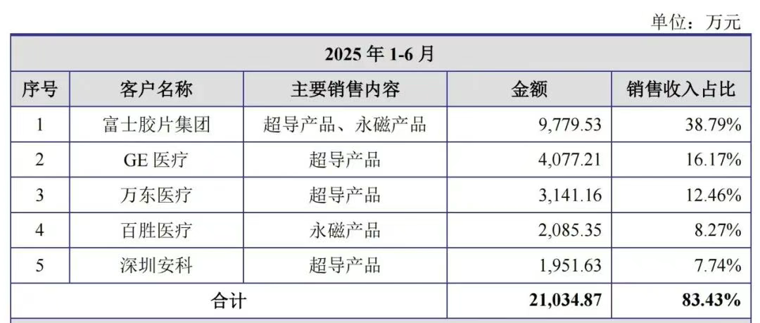 而其全球产业链中的关键一环,正是今日上交所主角——健信超导。健信超导的上市之路,刻着深深的“富士”印记。在2022年至2024年的报告期内,富士胶片集团始终是其无可争议的第一大客户,贡献的营收占比分别高达34.20%、44.20%和42.71%,即使在2025年上半年,这一比例仍维持在38.79%的高位。