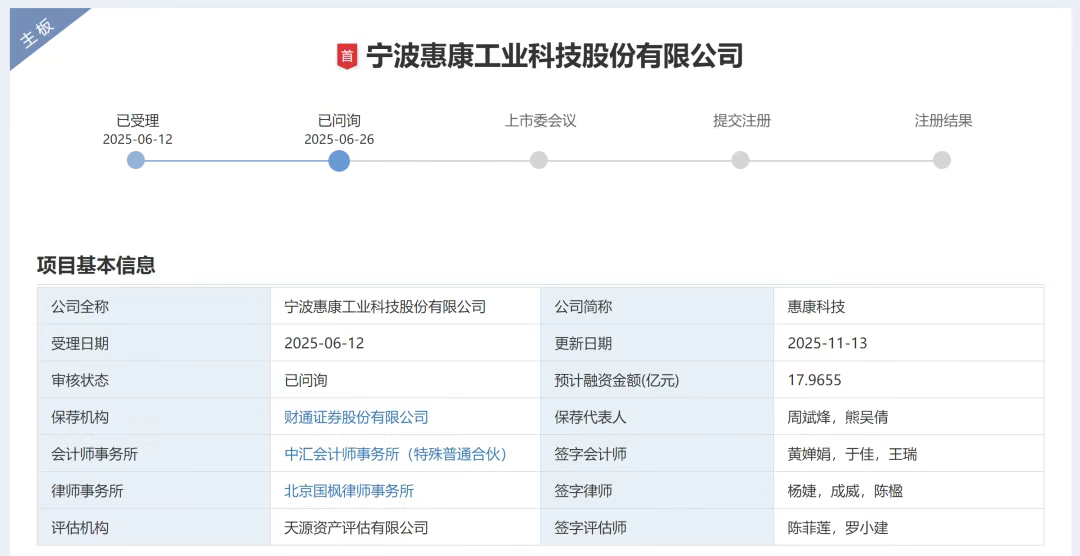 这一改写进程中的另一位关键“执笔人”,是同样来自慈溪的惠康科技。不久前,惠康科技的深交所主板IPO申请已获受理,目前处于“已问询”状态。