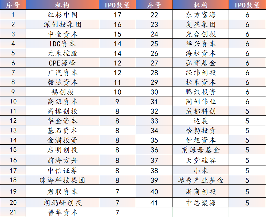 除此之外,IDG资本、元禾控股、CPE源峰、广汽资本、毅达资本、锡创投、高瓴资本跻身IPO数量前十之列。