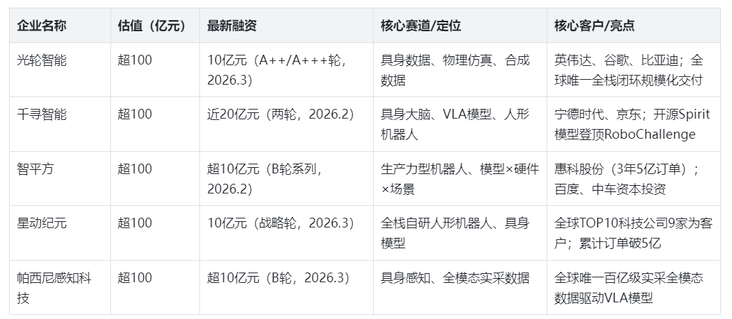 当前具身智能行业核心痛点是高质量数据供给不足,光轮智能凭借全栈闭环的核心能力,有效解决行业痛点;此次融资后,公司估值进一步提升,成功跻身行业头部阵营。具身智能领域百亿估值企业一览(不完全统计,截至2026年3月11日,仅含明确融资信息)