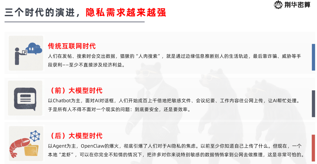 随着以 OpenClaw 为代表的 AI Agent 产品在全球范围内迅速普及,企业级 AI 应用的安全问题正从边缘议题成为行业核心命题。在荆华密算创始人林修醇看来,当前阻碍 Agent 大规模落地的关键瓶颈集中在两个维度。