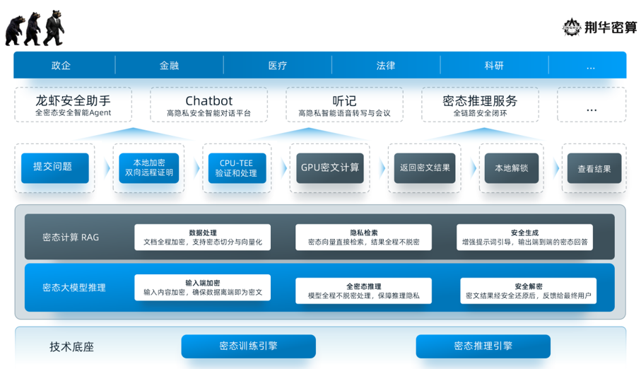 在产品布局上,荆华密算面向数据高敏感行业提供高密级的本地化私域部署方案,构建覆盖“输入-推理-输出”全流程的密态计算防护体系;面向开发者与C端用户,推出密态推理平台和“龙虾安全卫士”,支持跨平台、多终端即插即用;同时针对高价值私域数据领域,基于密态训练引擎,实现数据真正以密文形式的租赁式出售。首批商业落地场景覆盖政企、金融、医疗、法律、科研等行业。
