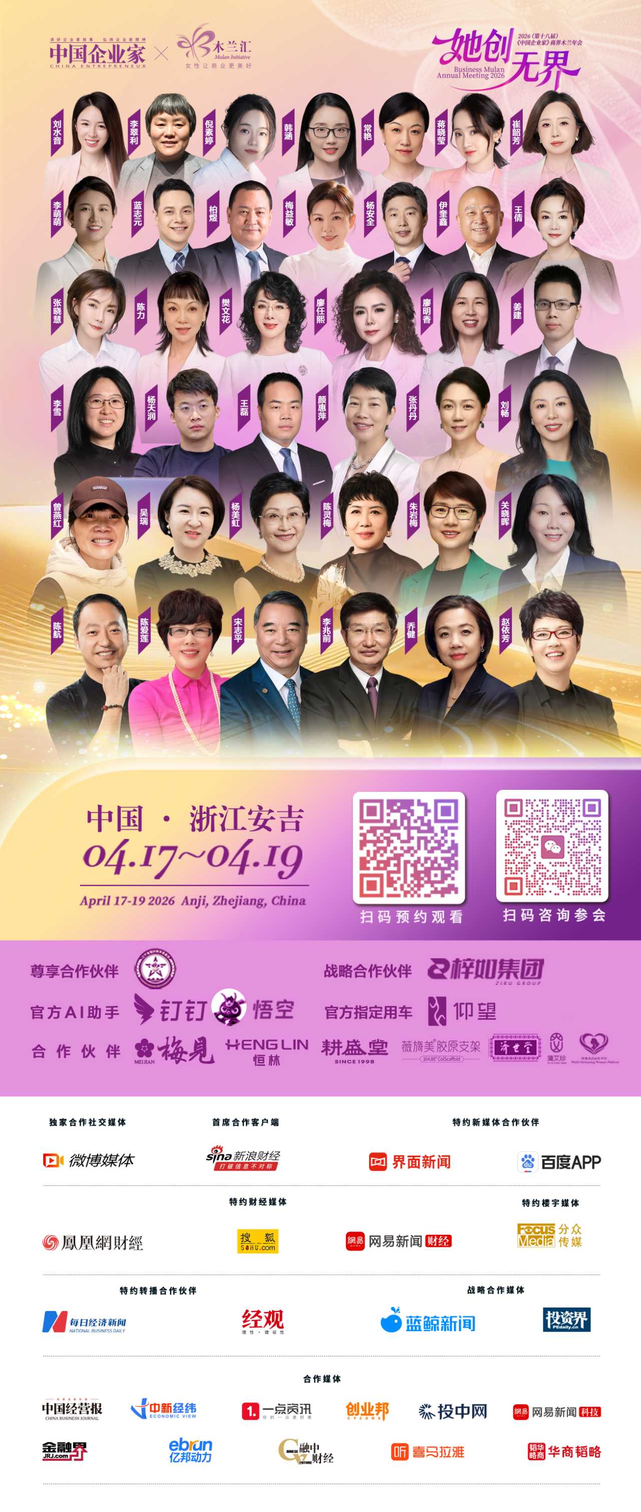4月17日至19日,2026(第十八届)《中国企业家》商界木兰年会将在浙江安吉召开。届时,全国工商联原副主席、中国民营经济研究会前会长李兆前,联想集团高级副总裁乔健,中国上市公司协会会长、中国企业改革与发展研究会首席专家宋志平,华策影视集团创始人赵依芳等上百位知名企业家、创业者、专家学者将齐聚于此,共同开启一场关于商业、科技浪潮与女性领导力的深度讨论盛宴。