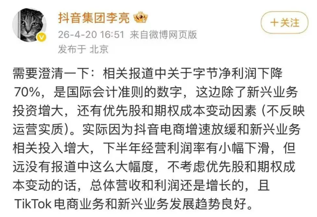 当天下午,抖音集团副总裁李亮通过个人微博转发回应,给这组数字做了一个“拆解”。他说,报道中提到的净利润下滑70%,是按国际会计准则计算的结果,里面包含两大块并不反映公司真实运营情况的因素:一是新兴业务投资大幅增加,二是优先股和期权成本变动。