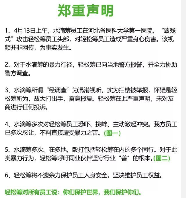 随后,轻松筹也发布声明,称水滴筹员工“致残式”攻击轻松筹员工头部,水滴筹所谓“经调查”为混淆视听,实为扫楼被举报,怀疑是轻松筹所为,故大打出手,蓄意报复。轻松筹在此声明,未对友商进行任何投诉。轻松筹还表示,水滴筹多次对轻松筹员工恐吓、挑衅、主动激起冲突。